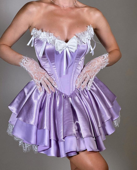 Stunning Purple Strapless A-Line Satin Lace Short Prom Dresses Homecoming Dress ED02688