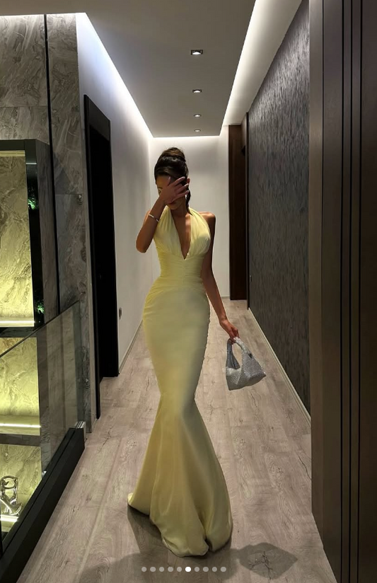 Fashion Butter Yellow V-Neck Mermaid Chiffon Long Prom Dresses Formal Evening Gowns with Open Back ED02760