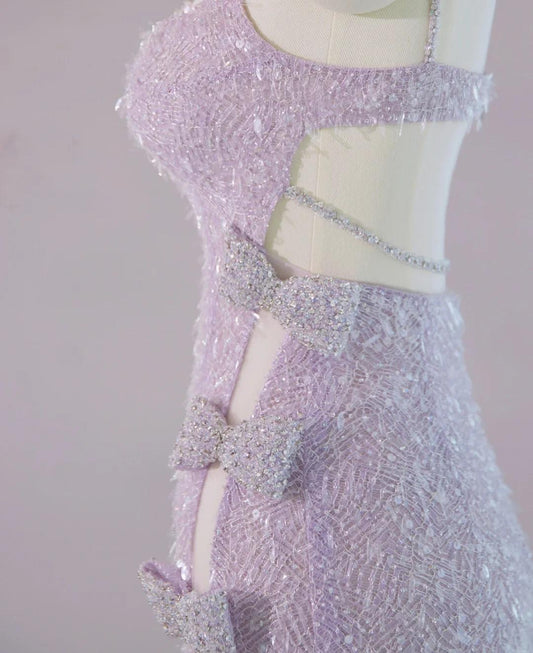 Stunning Light Purple V-neck Sheath Lace Beading Long Prom Dresses Formal Evening Gowns with Slits ED02860