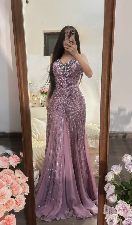 Stunning Purple V-neck Mermaid Beaded Chiffon Long Prom Dresses Vintage Evening Gowns ED02954