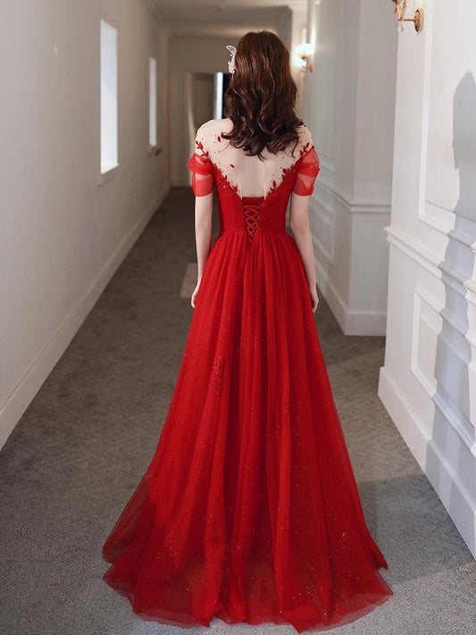 Red Off Shoulder Long Party Dress, A-Line Tulle Evening Dress Formal Gown prom dress evening dress cg21035
