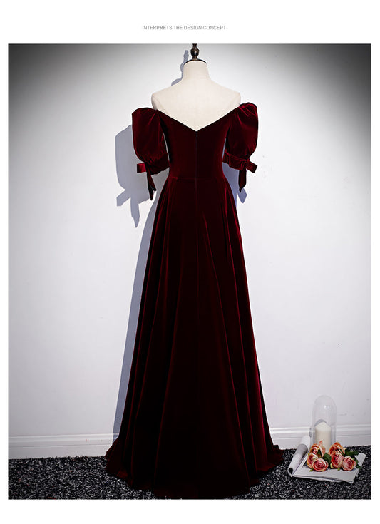 Princess Velvet Short Sleeves Long Red Prom Dresses SH041