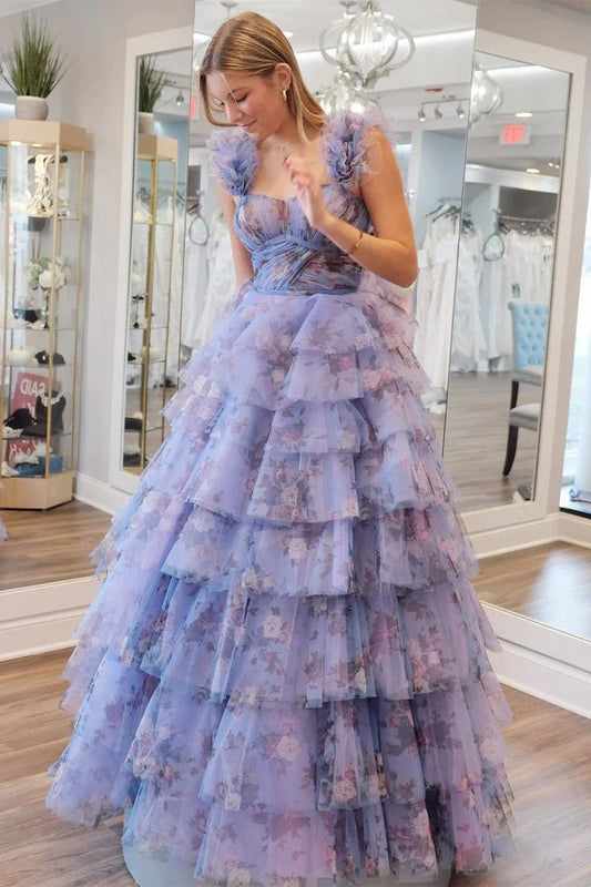 Print Flutter Sleeve Ruffle Tiered Long Prom Dress fg4607