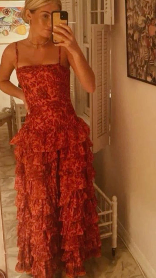 Pretty A Line Spaghetti Straps Floral Red Sleeveless Ruffles Evening Prom Dresses SD1421