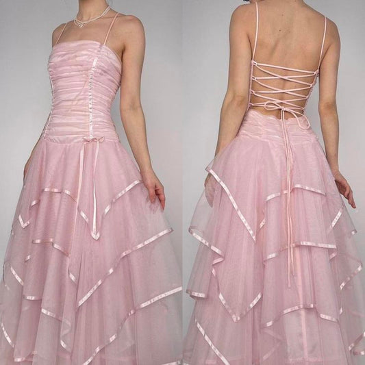 Pink Vintage A Line Spaghetti Straps Layered Tulle Prom Dress Party Dress SH3662