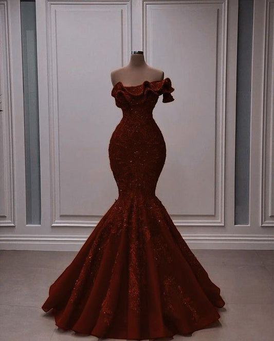 Pretty Mermaid Strapless Rust Red Lace Prom Dresses Long Party Dress SD2296