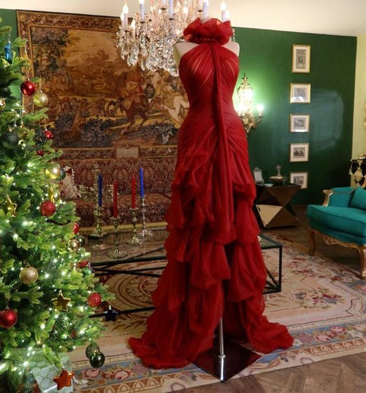 Mermaid Halter Red Velvet Party Dress Long Prom Dress P879