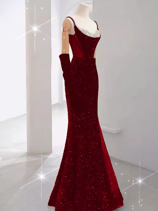 Mermaid Straps Velvet Red Party Dress Long Backless Prom Dress P876
