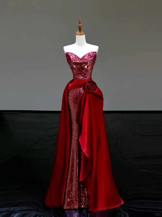 Modest Mermaid Strapless Red Floor Length Evening Dress Sequin Prom Dresses SD1805