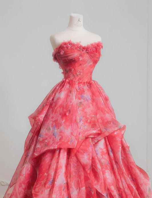 Gorgeous Red A-Line Strapless Printed Tulle Wedding Dress Sweet Long Prom Dresses ED02195
