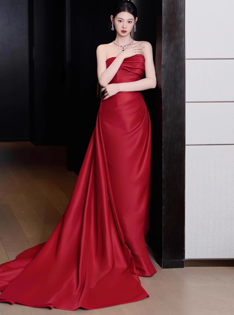 Gorgeous Sheath Strapless Red Satin Prom Dresses Formal Summer Wedding Guest Dresses Wedding Guest Outfits DP2279
