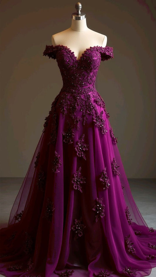 Gorgeous Red A-line Off-the-shoulder Tulle Beaded Long Prom Dress Formal Applique Evening Dress ED01977