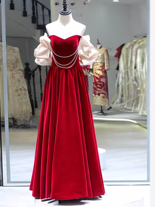 Gorgeous A line Off The Shoulder Velvet Red Prom Dress P1879