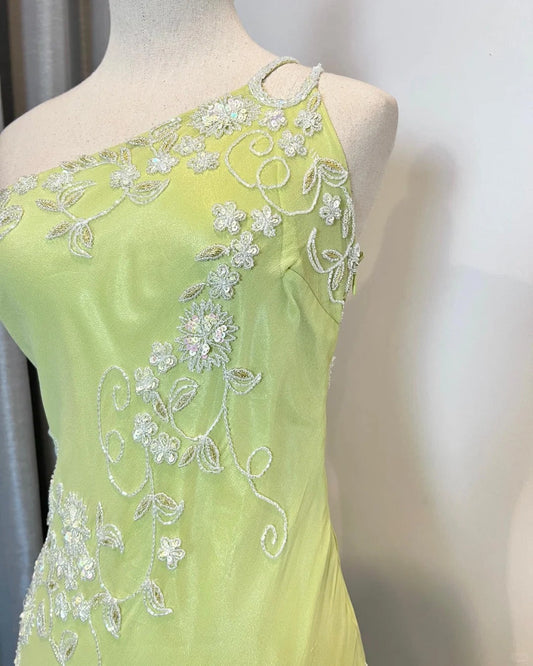 Fresh Green One Shoulder Sequin Embroidered Chiffon Mermaid Prom Dress P3392