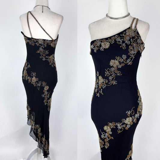 Black Gold Vintage Fashion Elegant Delicate Silver Floral Beads Long Chiffon Tulle Ball Gown Evening Dress Party Dress Prom Dress Hem Asymmetric gh3721