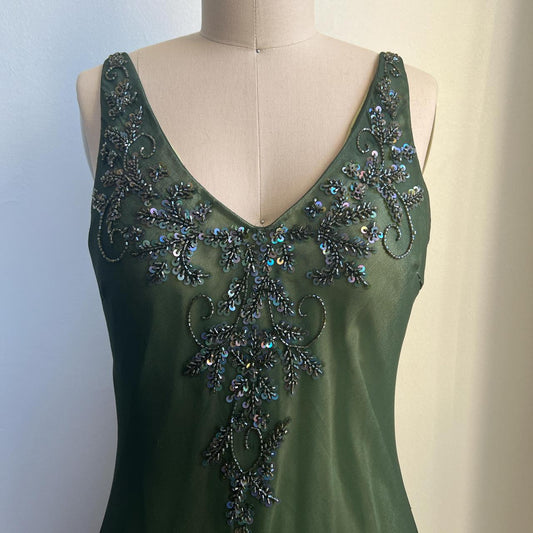 Green vintage elegant delicate floral beaded spaghetti straps long satin princess court style ball gown evening dress gh3704