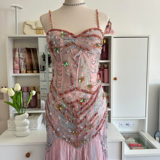 Pink Stunning Vintage Flowing Elegant Delicate Beaded Open Back Long Floor Length Mermaid Style Skirt Satin Ball Gown Evening Gown Birthday Party Gown Prom Gown gh3835