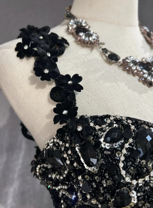 Black Luxury Gorgeous Vintage Shiny Elegant Delicate Floral Gemstone Rhinestone Beads Satin Long Mermaid Floor Length Trail Fairy Ball Gown Evening Gown Party Gown Prom Gown Lola's Dinner gh3855