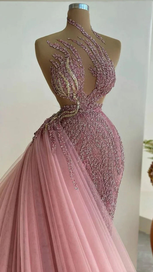 Pink Halter Tulle Fashion Elegant A-Line Tulle Long Ball Gown Evening Dress Party Dress gh3107