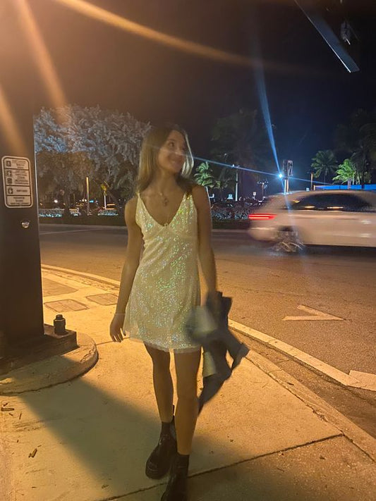 White Iridescent Sequins Lace-Up Mini Homecoming Dress gh1395