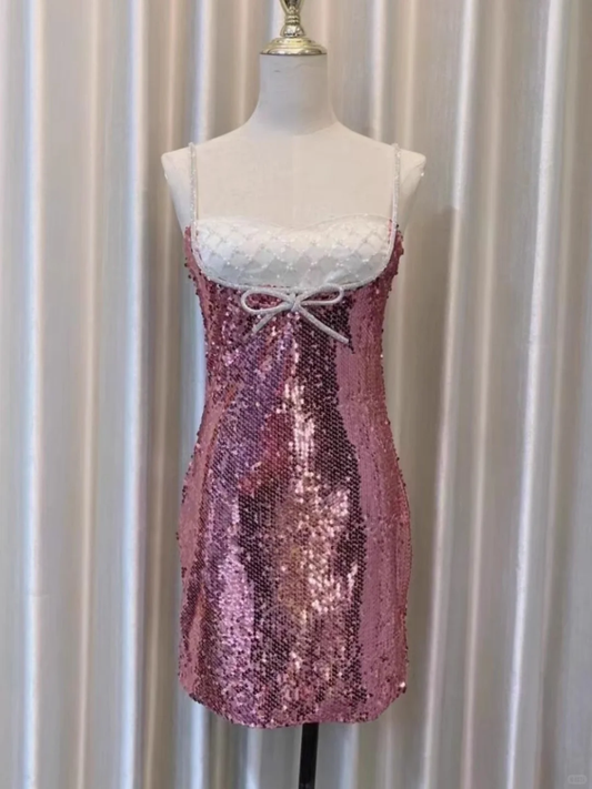 Sweet Pink Satin Sequins Cocktail Dress Short Birthday Outfits Homecoming Dress S368