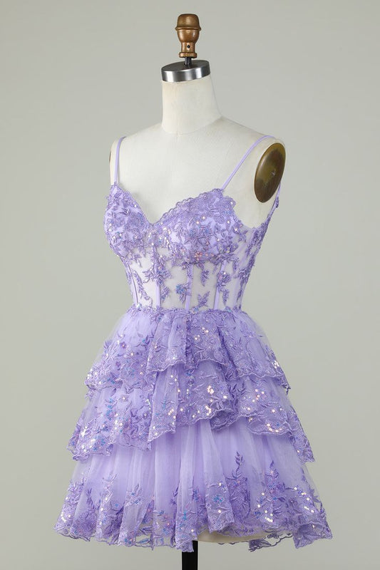 Straps Lavender Sequins Corset Layered Homecoming Dress fg3729