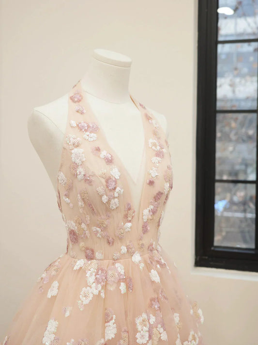 Pink V-Neck Tulle Sequins Short Prom Dress, Cute A Line Backless Homecoming Dress ED01326