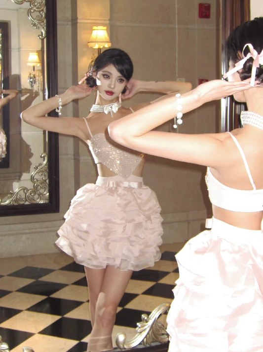 Pink Sheath Spaghetti Ruffle Sequin Homecoming Dress Evening Dress SH1841