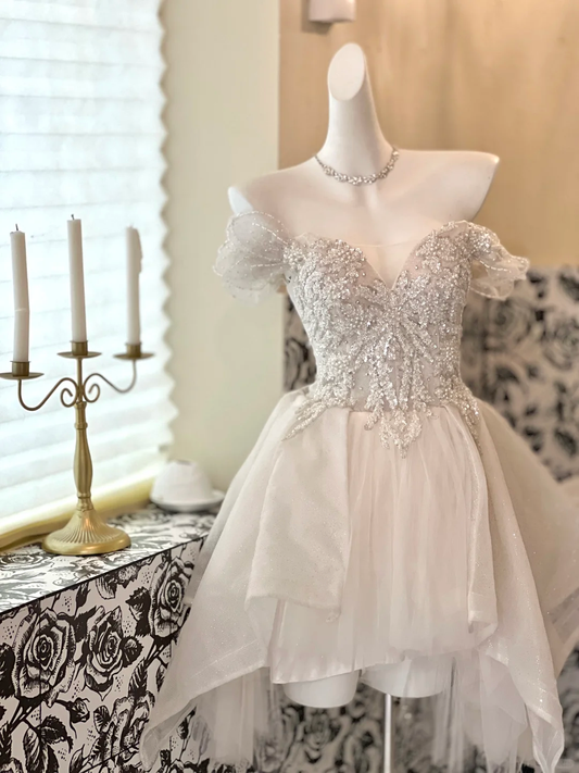 Gorgeous A Line Off the Shoulder Beaded Sequin Tulle Short Homecoming Dress Cocktail Dress SH3359
