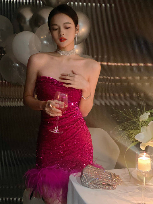 Cute Sheath Pink Feathers Sequin Sleeveless Mini Short Formal 8th Grade Homecoming Dresses Summer Middle School Hoco Dress Homecoming Outfits Birthday Dress DH748