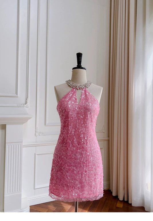Cute Sheath High Neck Pink Sequin Formal Short 8th Grade Homecoming Dress Summer Middle School Hoco Dresses Birthday Outfits W985
