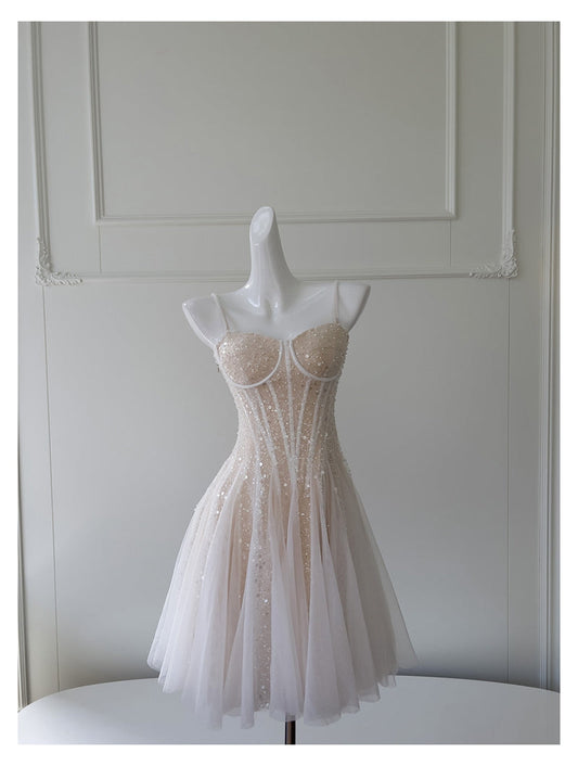 Cute A line Spaghetti Straps Champagne Sequin Short Homecoming Dress Summer Middle School Formal 8th Grade Hoco Dresses Summer Homecoming Outfits DH85