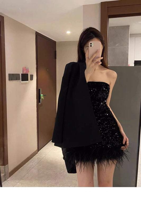 Classy Sheath Strapless Black Sequin Feathers Short Mini Formal 8th Grade Homecoming Dresses Middle School Hoco Court Dress 16th Birthday Dress Hoco Outfits DH1887