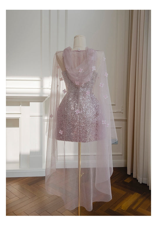 Cute A Line Spaghetti Straps Pink Sequin Grad Dress Inspo Formal 8th Grade Homecoming Dresses High School Hoco Court Dress Short Graduation Dress With Cape DH1909