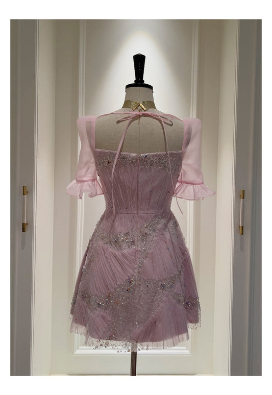 Cute A Line Square Neck Pink Sequin Grad Dress Inspo Short Mini Formal 8th Grade Homecoming Dresses High School Hoco Court Dress Graduation Dress Cocktail Dress 16th Birthday Outfits DH1916