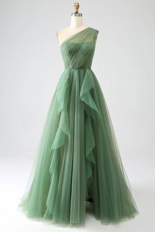 Dark Green A-Line One-Shoulder sequins Tulle Long Prom Dress ED01492