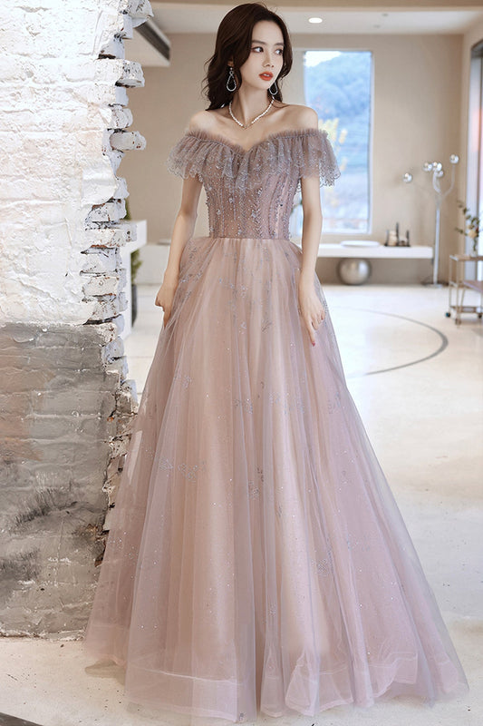 Cute tulle sequins long prom dress A line evening gown 10124