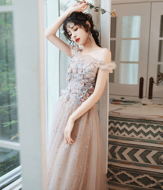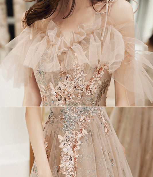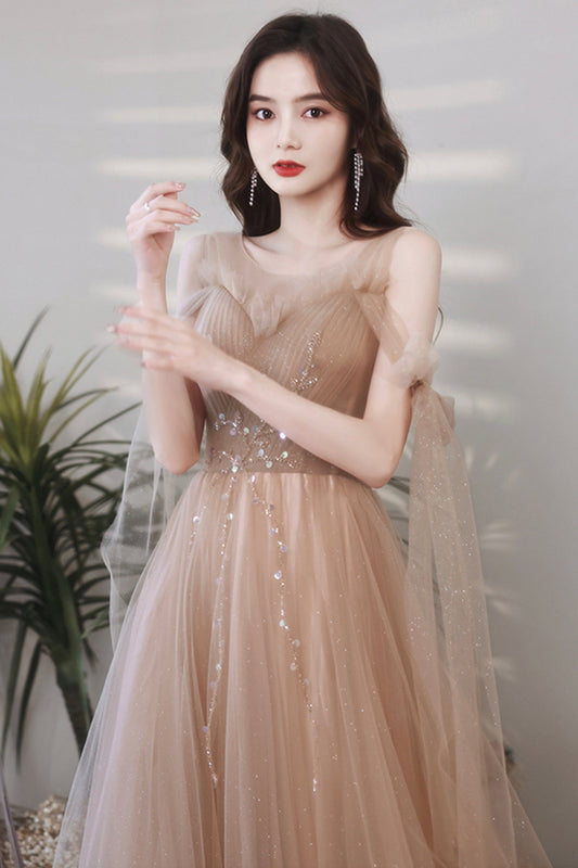 Cute tulle sequins long prom dress A line evening dress 8965