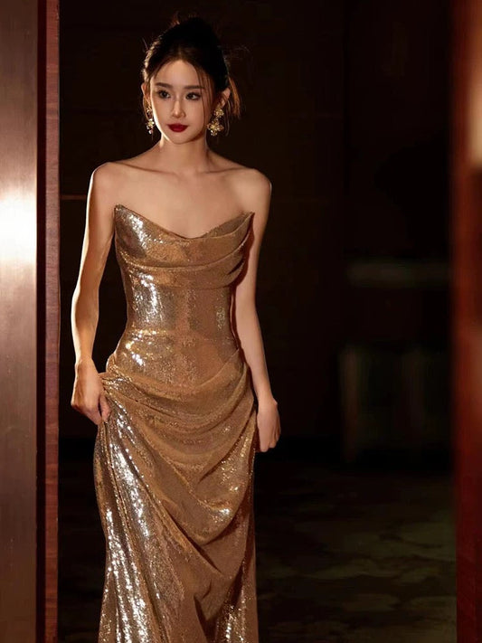 Classy Mermaid Sweetheart Sequin Gold Long Prom Dresses Formal Gown Summer Wedding Guest Dress Wedding Outfits For Guest W0723