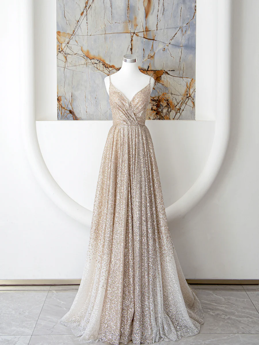 Champagne Shiny A Line V Neck Beaded Sequin Prom Dress Evening Dress SH2538