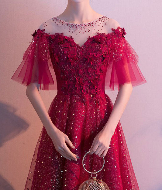 Burgundy A-Line Tulle Sequin Long Prom Dress, Burgundy Formal Dress ED0697