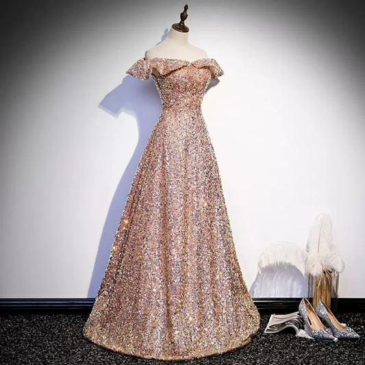 A line Off the Shoulder Pink Sequin Long Prom Dresses SH129