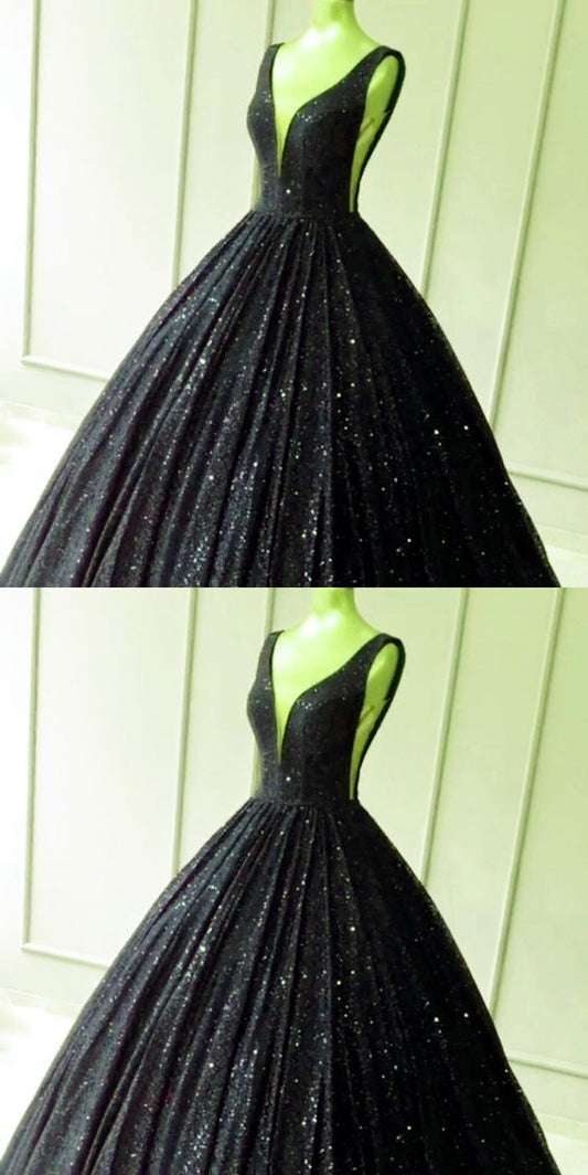 Black v neck tulle sequins long prom dress, evening dress cg3912