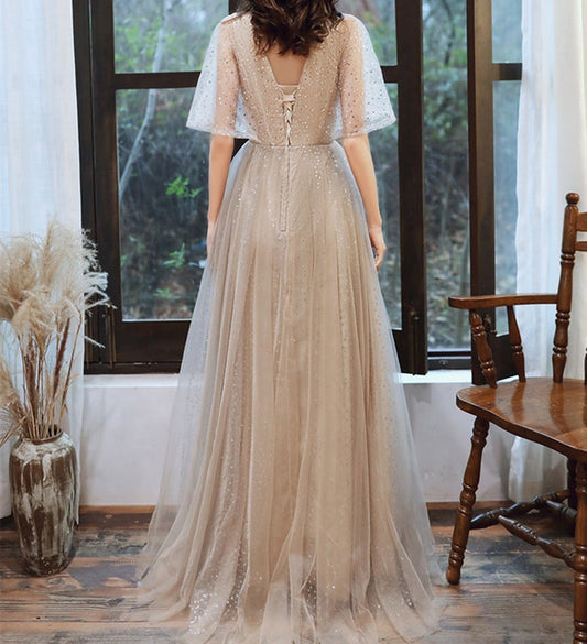 ELEGANT CHAMPAGNE ROUND NECK SEQUIN LONG PROM DRESS TULLE FORMAL DRESS cg19596
