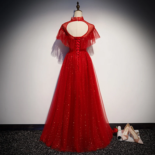 Red Sequins Tulle High Neckline Long Shiny Prom Dress, Red Long Evening Dress Party Dress cg22117