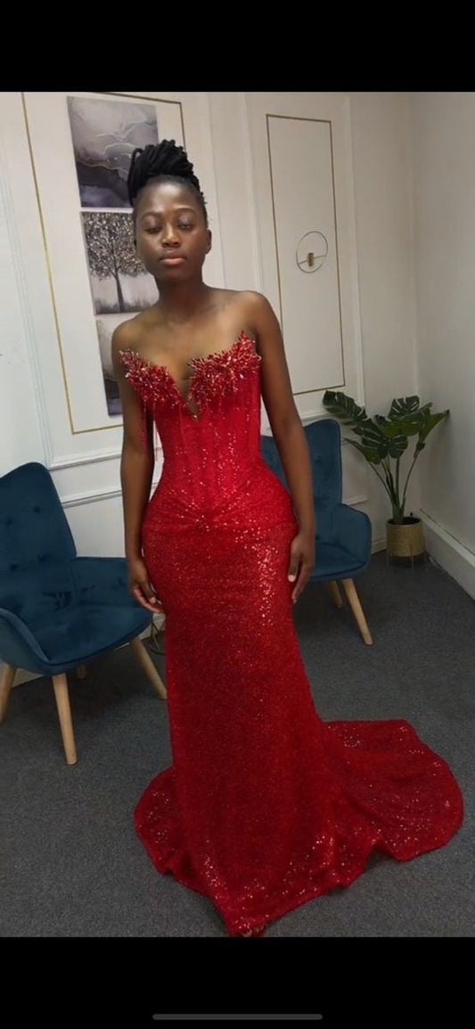 Modest Mermaid Strapless Red Sequin Beads Formal Gown 20th Birthday Dress Prom Dresses 18th Birthday Outfits W0336