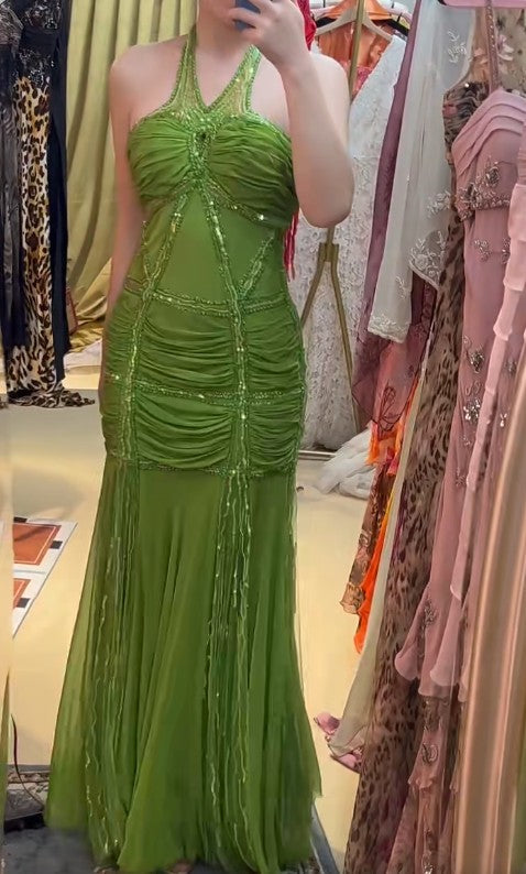 Vintage Green Halter Mermaid Chiffon Beaded Sequin Prom Dress Elegant Formal Evening Dress ED01900