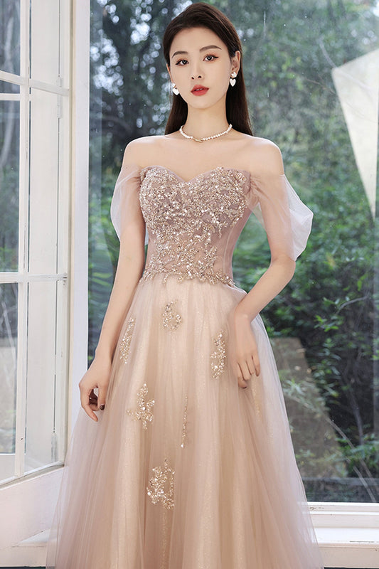 Sweet Blush Pink Spaghetti Straps A-Line Sequin Tulle Long Prom Dresses Birthday Evening Gowns ED02685