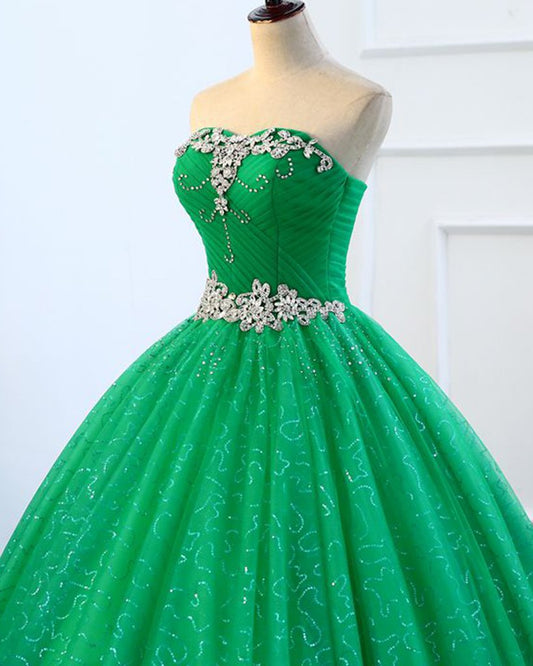 Strapless Green Sequins Tulle Long A Line Beaded Prom Dress, Formal Dress KS7480