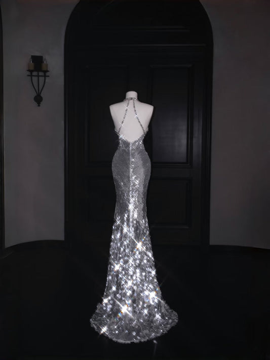 Sparkly Straps Mermaid Sequin Backless Prom Dress Evening Dress with Slit SH1722